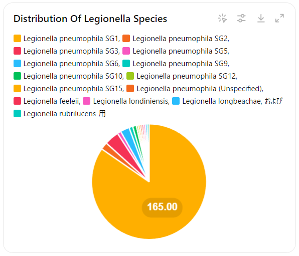 最後のL. pneumoniaeでは尿中抗原検査で注意が必要です。下記のグラフのようにレジオネラには複数の血清型や、L. pneumoniae以外の菌種(L. longbeachaeなど)がいますが、イムノキャッチ🄬4)などの尿中迅速検査キットは血清型1しかtargetにしておらず、血清型2-15は検出できません。