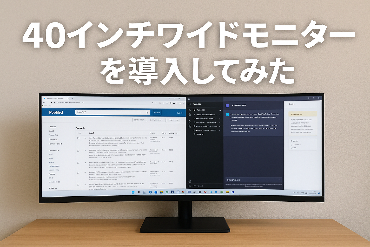 今回は臨床の話ではなく、論文執筆や学会発表の作業環境について。つい先日、仕事場にもワイドモニター(40インチ)を追加で導入しました。実は似たようなもの(44インチ・ウルトラワイドモニター)を自宅で使っていて、その快適さに慣れすぎてしまったので、職場でも同じ環境を作ることにしました。